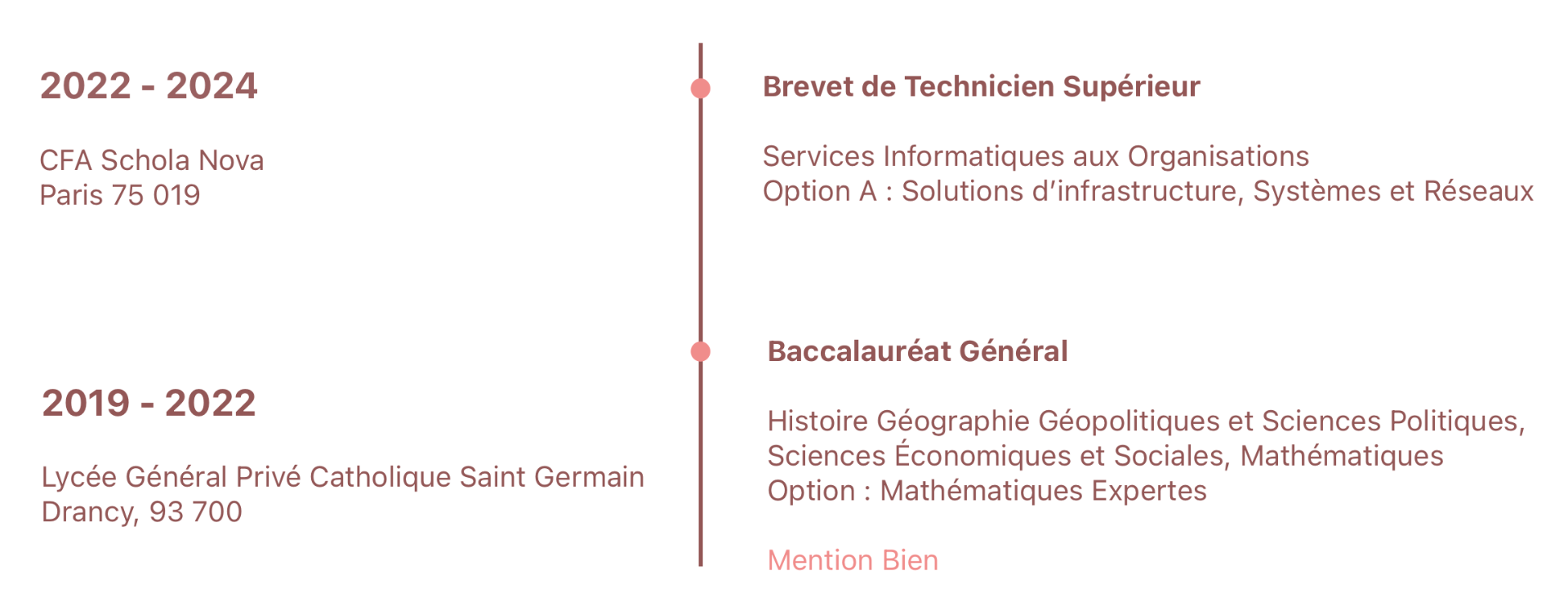 Après l'obtention de mon bac avec Mention Bien, mes souhaits d'orientation professionnelle se dirigeaient vers un domaine en constante évolution et perpétuelle demande : l'informatique. C'est ainsi que j'ai choisi le BTS SIO option SISR pour la poursuite de mes études. Après ce Bac +2, je souhaite continuer jusqu'au Bac +5 dans ce domaine pour me spécialiser particulièrement vers la cybersécurité.