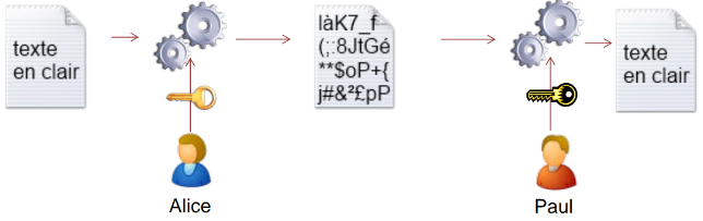 La clé utilisée pour le chiffrement est différente de celle utilisée pour le déchiffrement. Il est nécessaire d'utiliser deux clés :